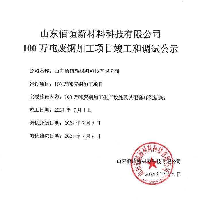 上一篇:山東佰誼新材料科技有限公司150萬噸廢鋼加工項目(一期)環(huán)保設施竣工、調(diào)試公示